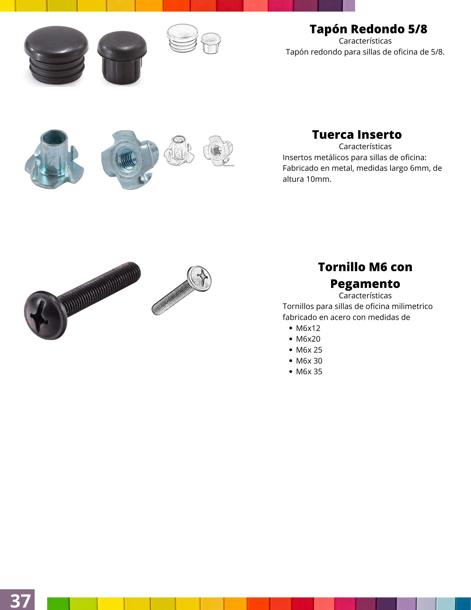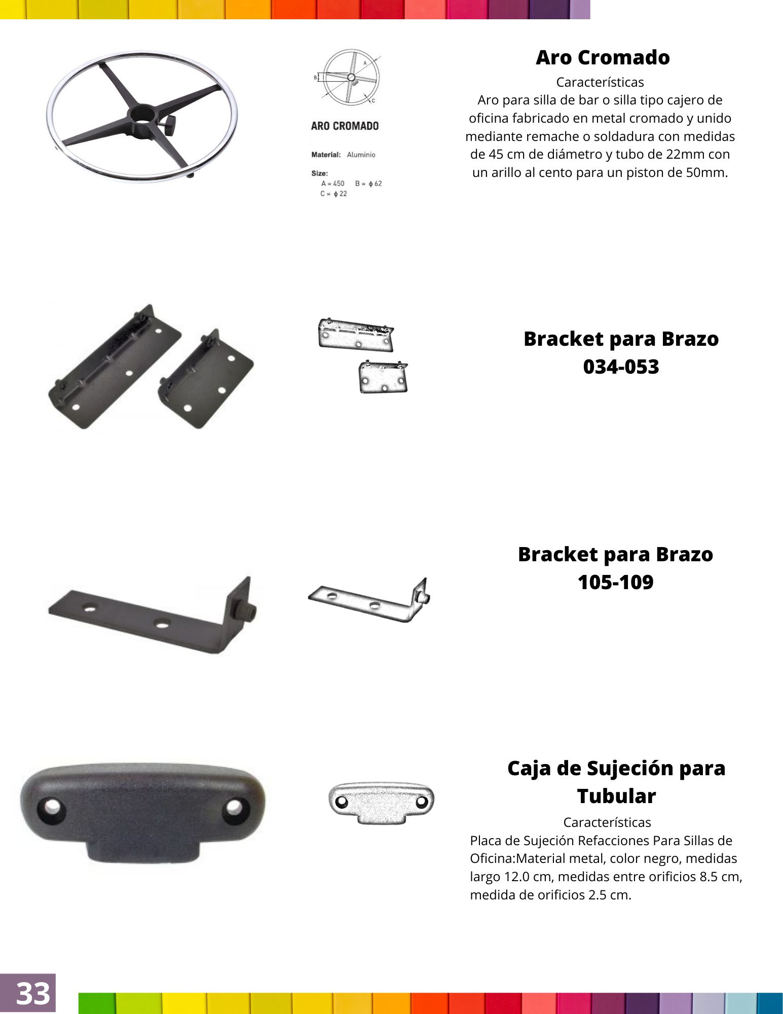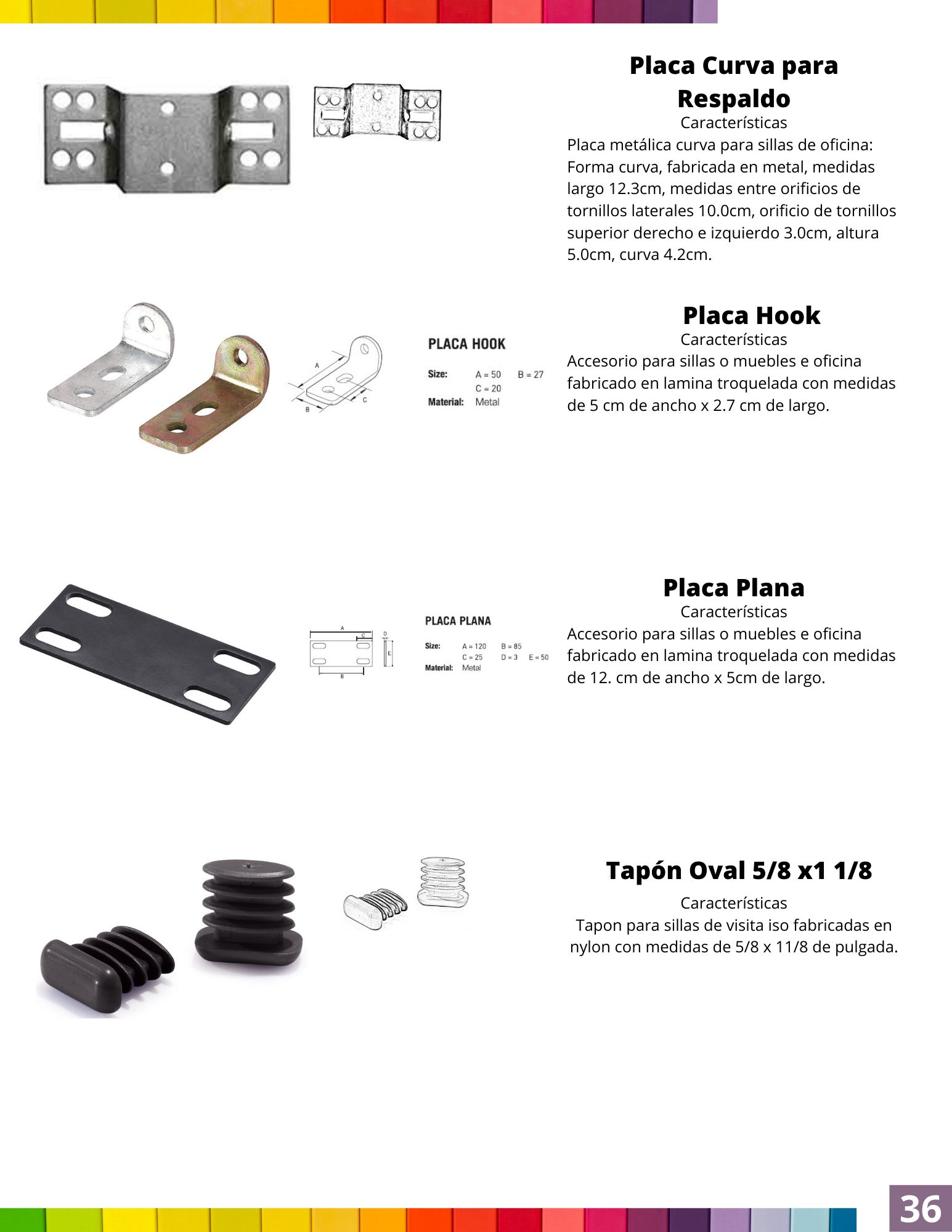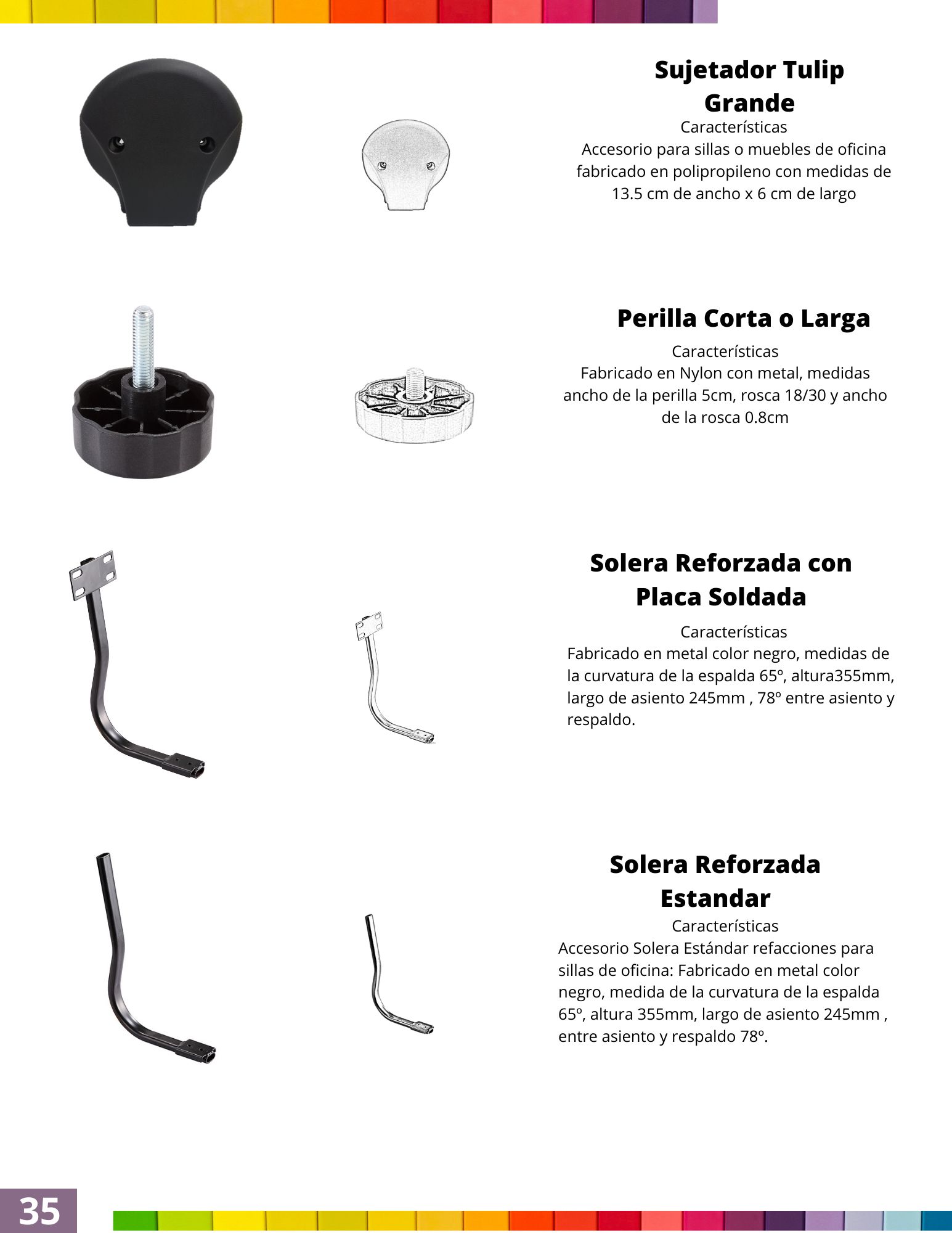 Nuestra amplia variedad de Accesorios para Sillas de Oficina como cabeceras, aros descansa pies, placas y tornillería, sujetadores, soleras, cubre solera y cubre pistón, tapones, todo lo que necesitas para poder reparar o armar tu propia silla, y si tienes duda de como usarlos nosotros te apoyamos con video tutoriales o por video llamada, es por esto que podemos brindarle las opciones necesarias para así adaptarnos a las necesidades de nuestros clientes, y si lo que buscas no se encuentra aquí o si no tienes una idea clara de lo que estas buscando no te preocupes nuestros técnicos especializados podrán brindarte la ayuda que necesitas buscando tu pieza tal cual o brindándote una opción lo más parecida a lo que buscas siempre tratando de respetar tu presupuesto.